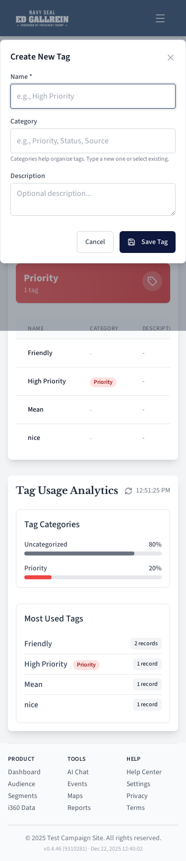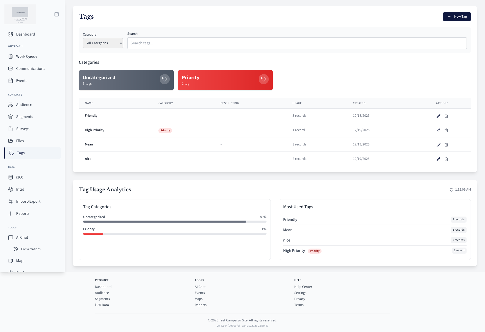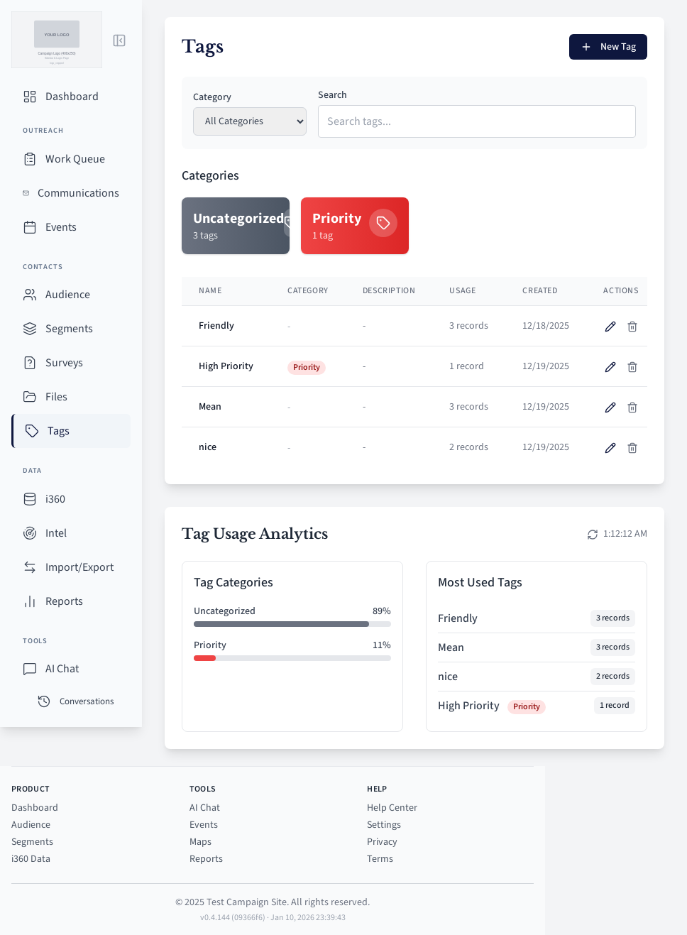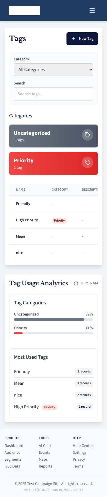 Tag management page for categorizing contacts.