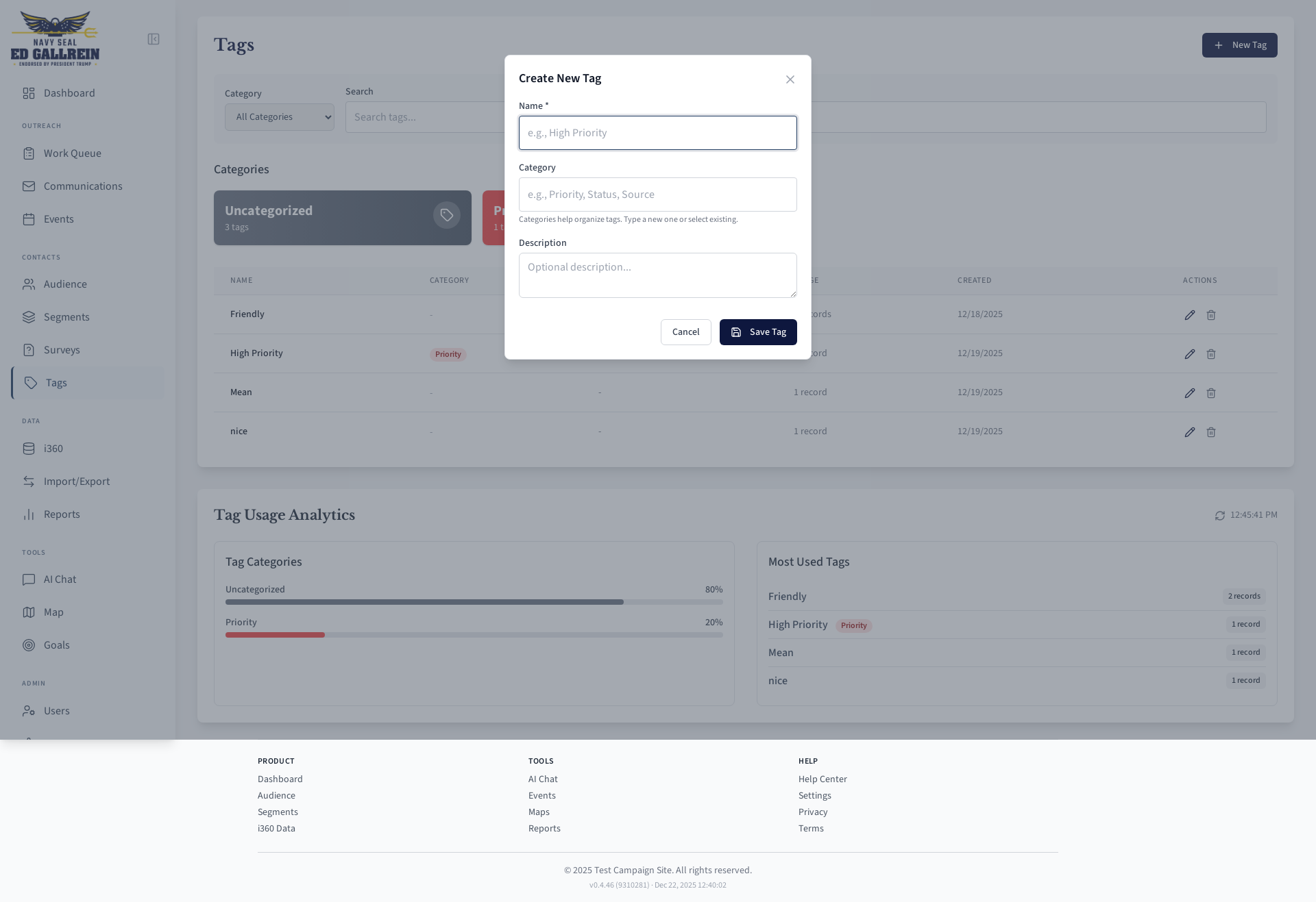 Tag creation modal.