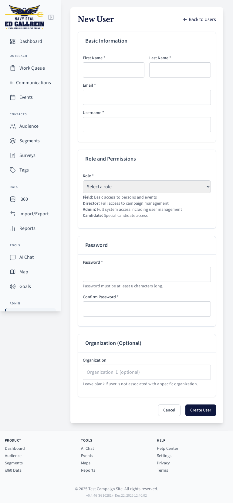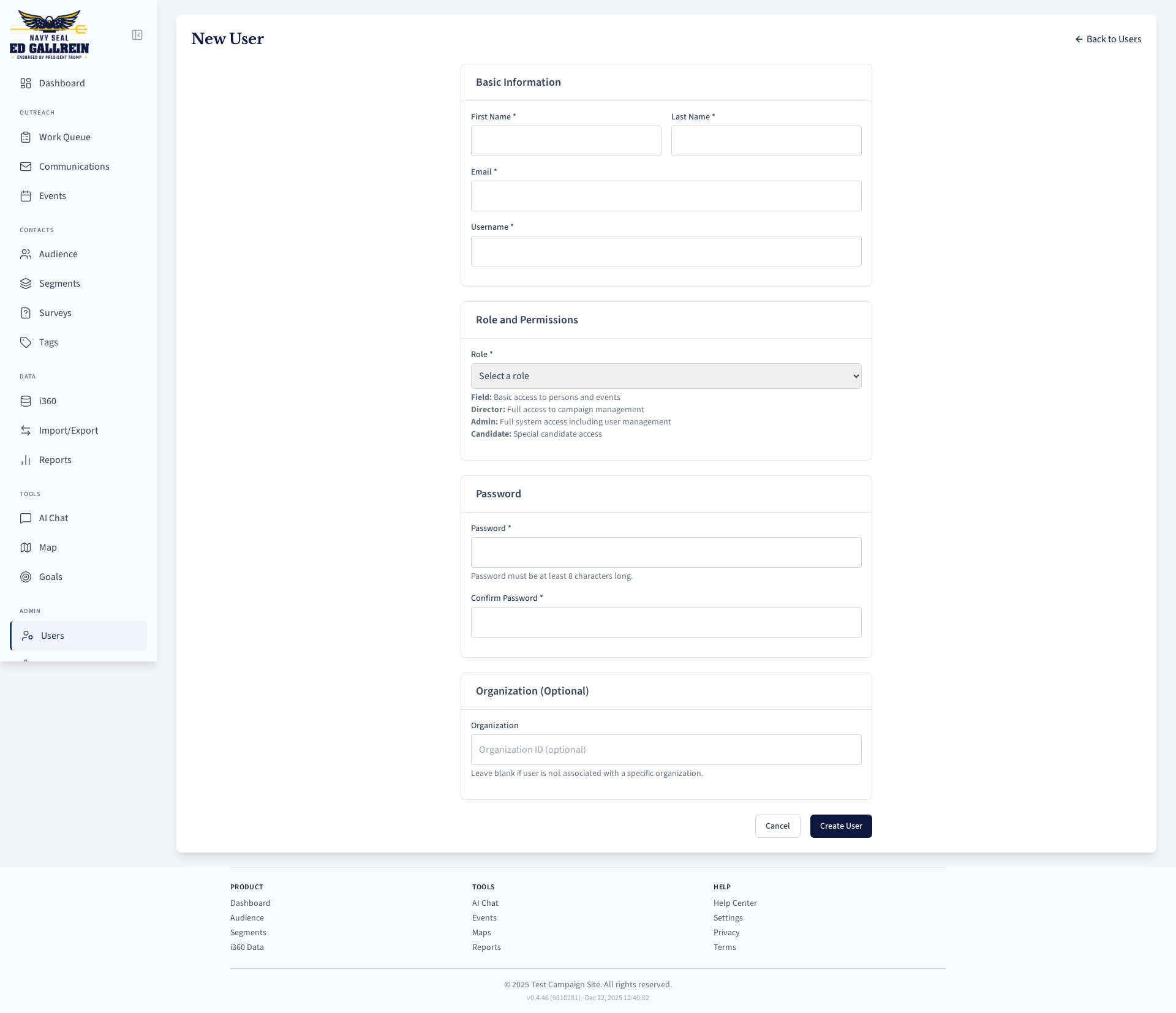 User creation modal.
